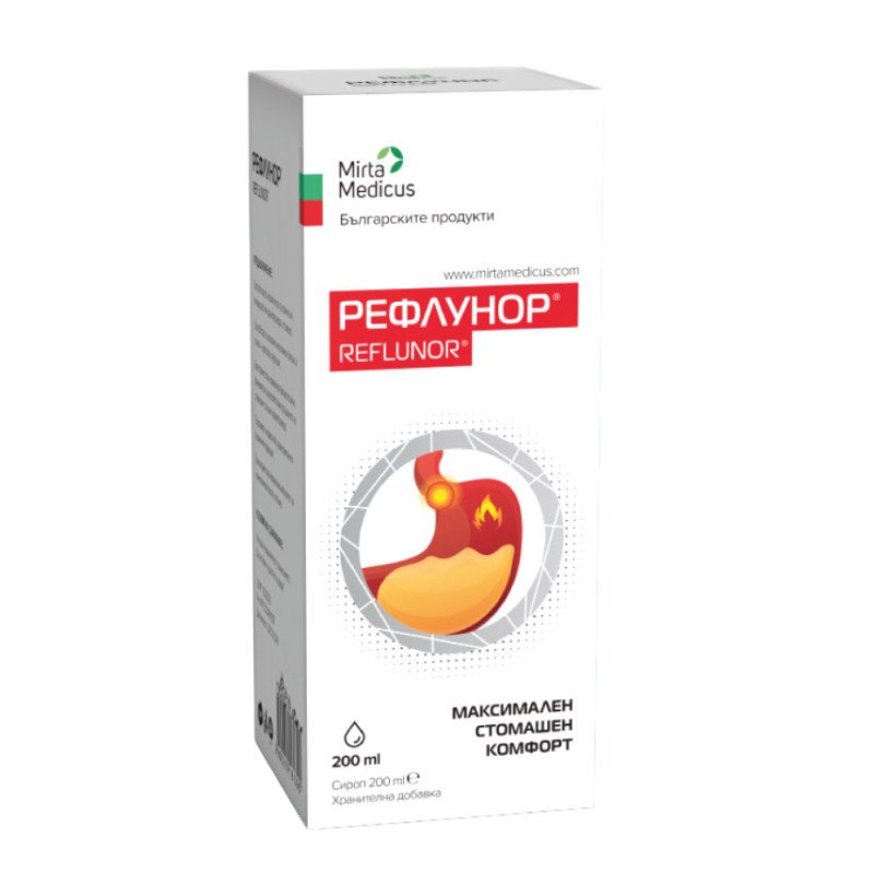 РЕФЛУНОР е сироп, предназначен за подпомагане на нормалното състояние на лигавицата на хранопровода и стомаха. Спомага за поддържането на алкално-киселинния баланс и нормализира солно-киселата секреция. Продуктът съдейства за предпазване от връщането на стомашния сок към хранопровода, подпомага нормалното храносмилане и ензимните функции, както и нормалния мотилитет на храносмилателната система.